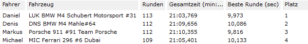 Erwartet wurde nun im Rennen eigentlich ein Zweikampf zwischen Markus und Denis um den Sieg, und zwischen Daniel und Michael um P3 - aber, soviel vorweg, es sollte anders kommen. Michael war ja am heutigen Abend schon mit dem M1 gut unterwegs, den Flow sollte er mitnehmen in die DTM. Zwar fuhr Markus vorne weg und war schlicht nicht einzuholen, im Dreikampf um P2 war Michael aber nicht aufzuhalten. Sein Ferrari lief von Runde zu Runde besser, Flow gefunden! Zwar waren es beim Zeileinlauf zwei Runden Rückstand auf Markus, aber auch zwei Runden Vorsprung auf Denis (P3) und Daniel (P4). Die schnellste Runde ging an Markus (8,517s), die schnellsten Runden der Verfolger lagen eng beieinander (Delta 0,066s).